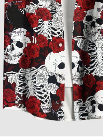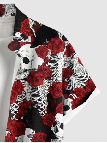 Plus Size Rose Flower Skulls Skeleton Print Buttons Pocket Hawaii Shirt For Men - Rojo - Rojo