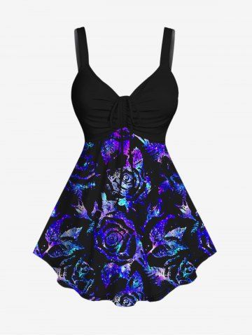 Plus Size Ruched Rose Glitter Print Cinched Tank Top