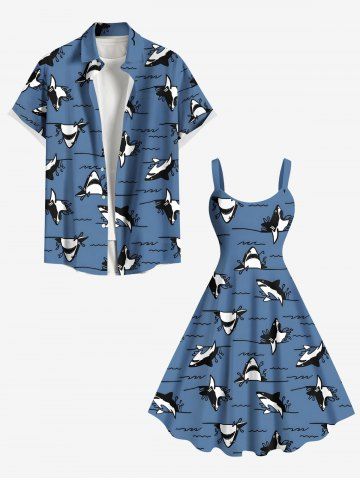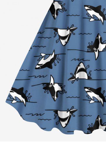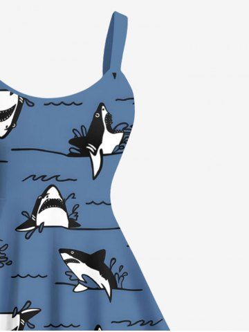 Plus Size Shark Sea Waves Print Hawaii A Line Tank Dress - Azul - Azul
