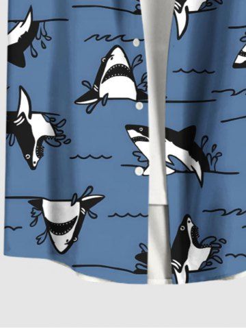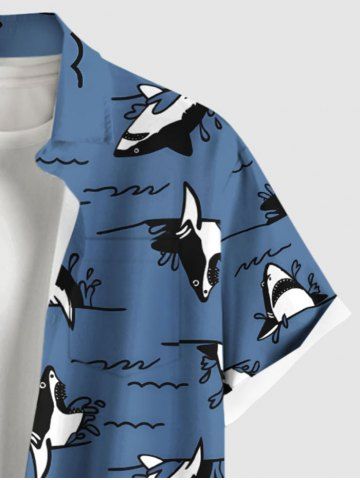Plus Size Shark Sea Waves Print Hawaii Button Pocket Shirt For Men - Azul - Azul