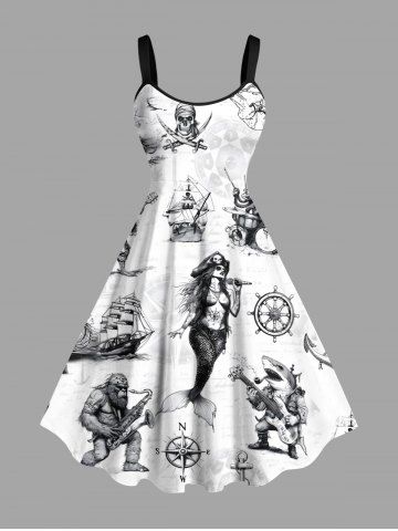 Plus Size Skull Pirate Mermaid Ship Rudder Cruise Print Hawaii Tank Dress - Blanco - Blanco