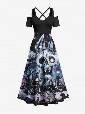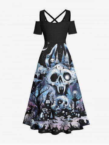 Plus Size Skull Tree Castle Moon Cloud Galaxy Print Halloween Costume Crisscross A Line Maxi Dress - Negro - Negro
