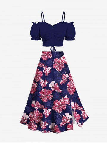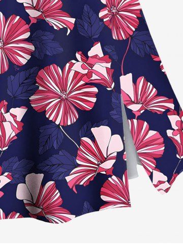 Plus Size Striped Hibiscus Floral Print Hawaii Split A Line Skirt - Azul Profundo - 3x