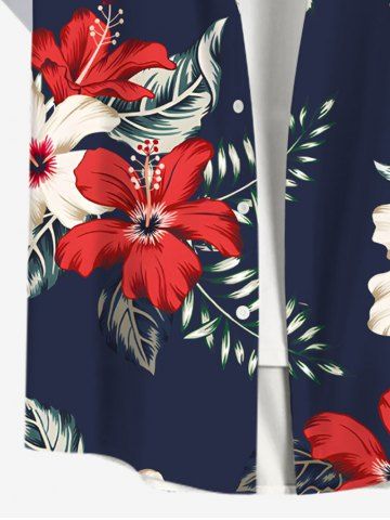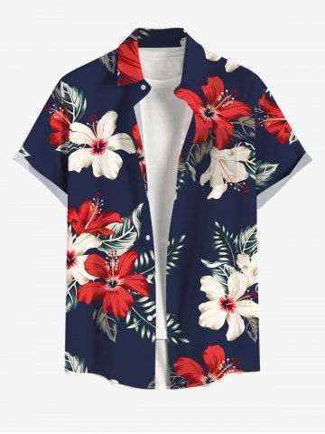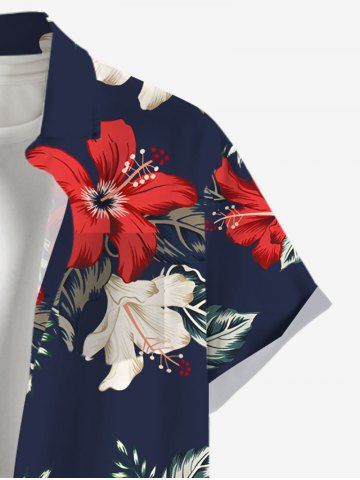 Plus Size Tropical Leaf Hibiscus Flower Print Buttons Pocket Hawaii Shirt For Men - Azul Profundo - L