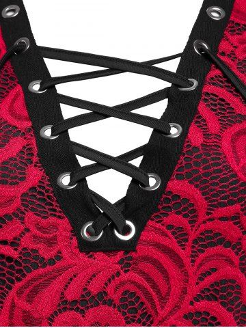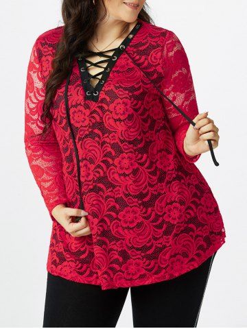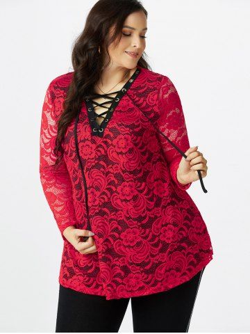 j*****e5Plus Size Lace Sheer Lace-up Long Sleeve TeeColor: DEEP RED Size: 5Xthis shirt is stretchy and Uber comfortable. the tie makes is just enough sexy.