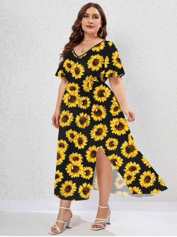 Plus Size Sunflower Printed Split Flutter Sleeves A Line Dress