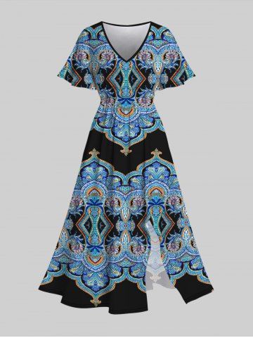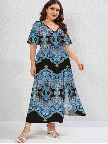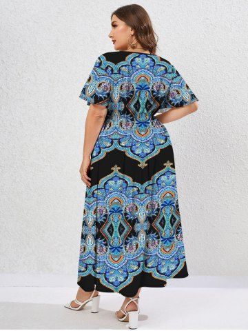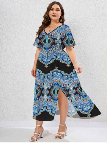 Plus Size Sunflower Printed Split Flutter Sleeves A Line Dress