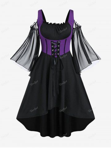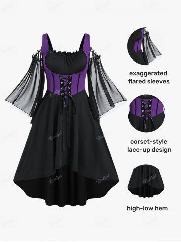Plus Size Lace Up Cold Shoulder Flare Sleeves High Low Ruched Renaissance Corset Dress