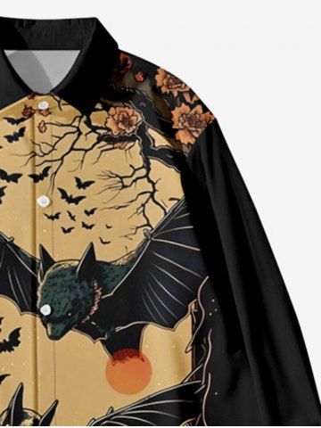 Plus Size Distressed Bat Tree Flower Sun Print Halloween Button Long Sleeves Shirt For Men - Negro - Negro