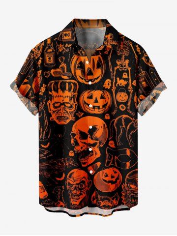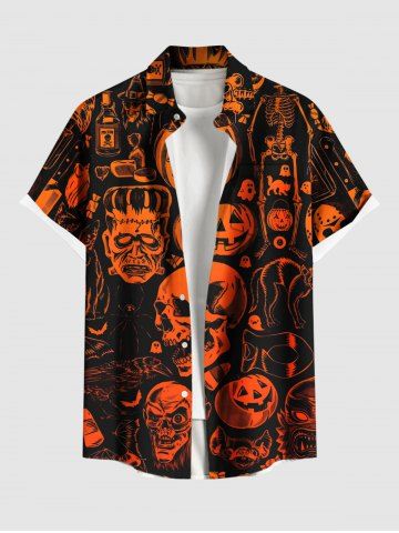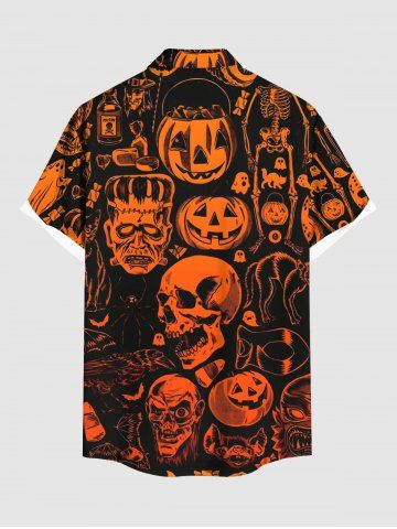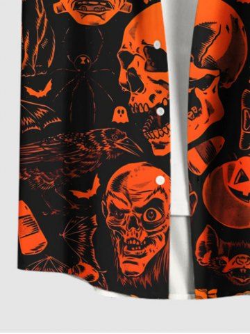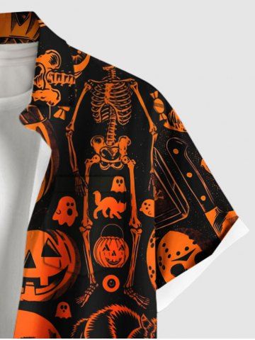 Plus Size Halloween Pumpkin Skulls Skeleton Ghost Print Buttons Pocket Shirt For Men - Negro - Negro