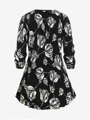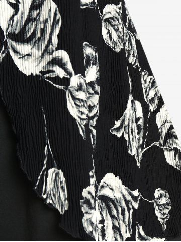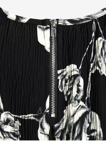 Camiseta de Doble Capa con Cremallera y Flores Plisadas - Negro - Negro