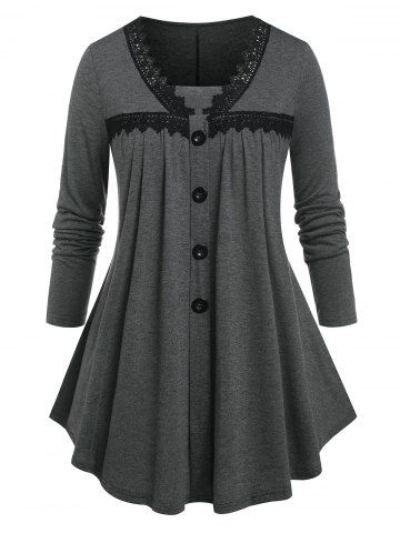 B*****b5Plus Size Lace Buttons Pleated T ShirtColor: GRAY Size: 3XLovely top with lace. Material is soft and comfortable, perfect fit and shipped fast. The matetial is lightweight but not see through. High quality and made very well.