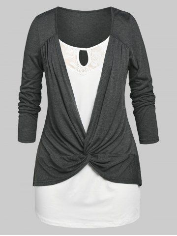 B*****b5Plus Size Faux Twinset Front Twist TeeColor: GRAY Size: 3XThis is a great top! Shipped fast and packaged nicely, soft and comfy material, designed well and fits perfectly!