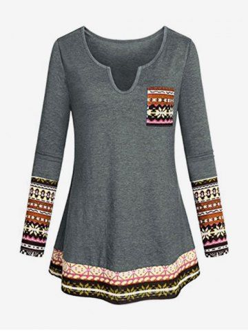 d*****h5Plus Size Lace Panel Pocket Raglan Sleeves V Notched T ShirtColor: DARK GRAY Size: 3X | US 22-24This one fits nice, and it feels nice. The lace doesn't feel itchy I'm a size 44D and that's the kind of cleavage that shows when I bend over