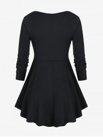 a*****55Ruched Crochet Trim Tee and 3D Jeans Lace-up Pattern Printed Flare Pants Plus Size OutfitsColor: BLACKi love the material. the pants I ordered were a little big but I'm ok with that. I can't wait to wear them.
