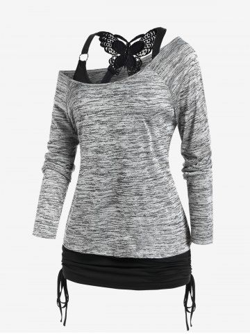 h*****95Plus Size Space Dye Skew Neck Tee and Butterfly Lace Cinched Ruched Top SetColor: GRAY Size: 1X | US 14-16Love it and you can wear it separately which is even better