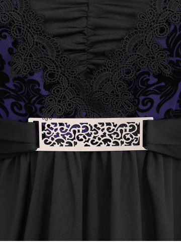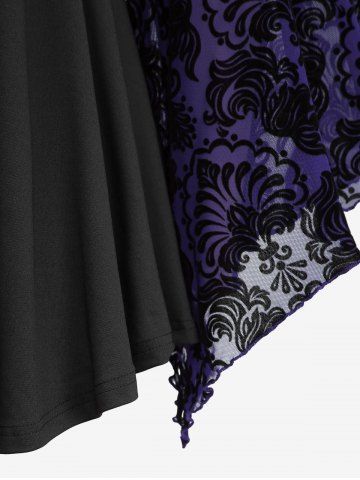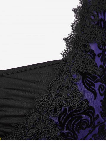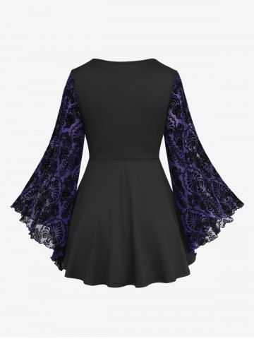 Plus Size Lace Applique Ruched Buckle Floral Mesh Flare Sleeves T-shirt - Púrpura - Púrpura