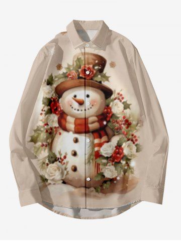 Plus Size Christmas Snowman Floral Holly Leaf Print Button Long Sleeves Shirt For Men - Café Luz - L