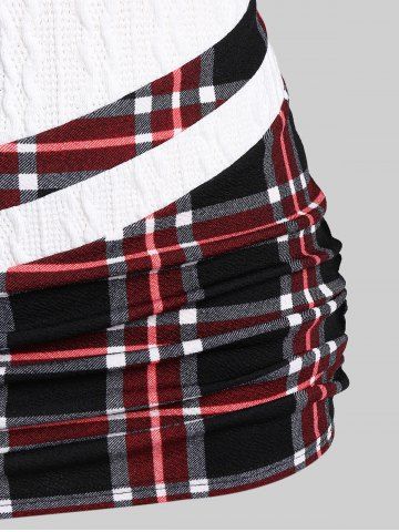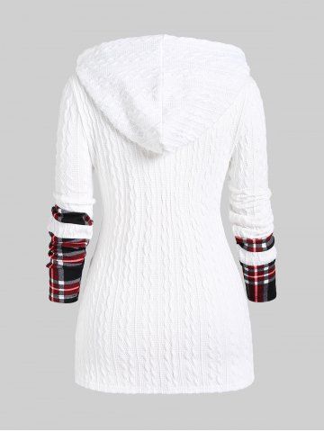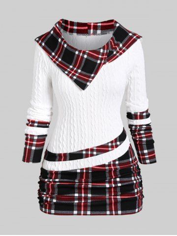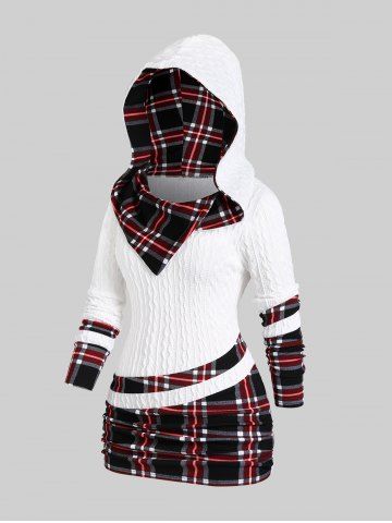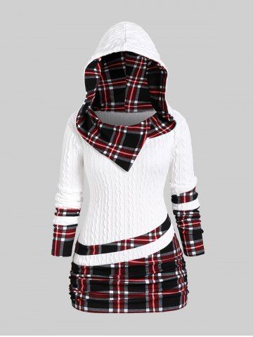 r*****i5Plus Size Plaid Textured Cable Knit Patchwork Asymmetrical Neck Ruched Hooded SweaterColor: WHITE Size: 4X | US 26-28This is probably the most comfortable hoodie I've ever worn. It's also really stylish. Not the biggest fan of the asymmetrical design of the sleeves (you can kinda tell in the picture but I didn't notice until I had worn it a couple of times).