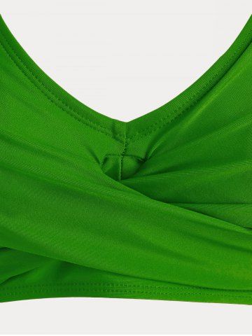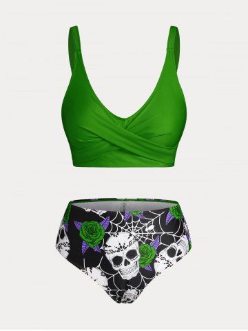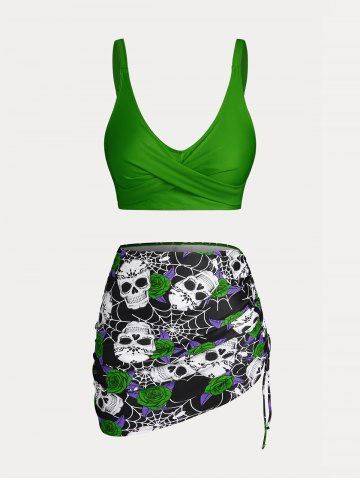 Plus Size & Curve Skull Rose Print Crossover Three Piece Bikini Swimsuit - Verde De Mar - 2x