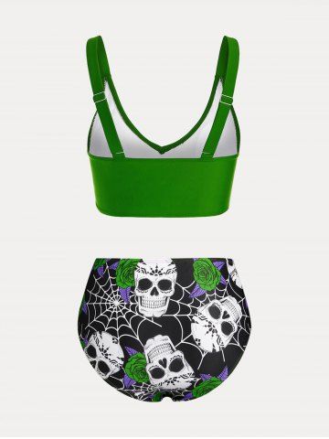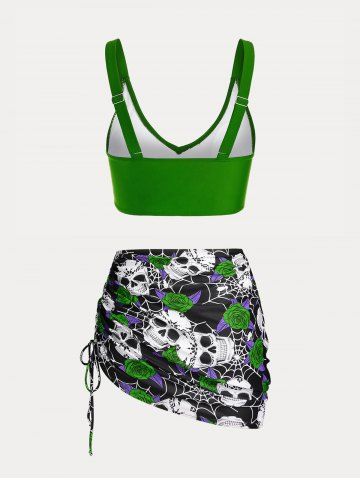 Plus Size & Curve Skull Rose Print Crossover Three Piece Bikini Swimsuit - Verde De Mar - 4x