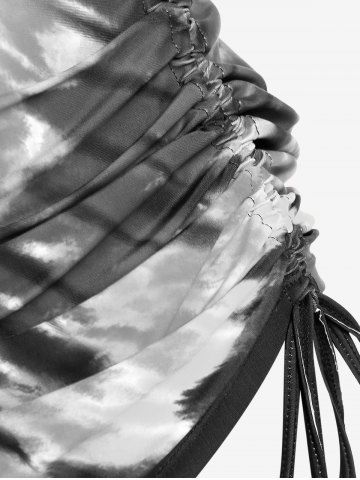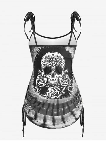 Plus Size Skull Rose Tie Dye Print Cinched Ruched Tie Boyshorts Tankini Swimsuit - Gris Oscuro - Gris Oscuro
