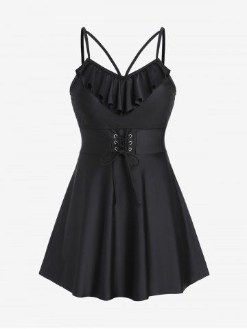 T*****e5Plus Size Lace-up Ruffle Strappy Tankini SwimsuitColor: BLACK Size: 2X | US 18-20Love it, fits great and flattering on. Bust size is 47 1/2 or H or I 38. So I remove the padding otherwise great!