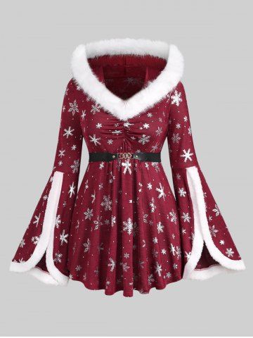 Plus Size Christmas Snowflake Print Faux Fur Ruched Belt Split Flare Sleeves Hooded T-shirt - Color Rojo Oscuro - 3x | Us 22-24