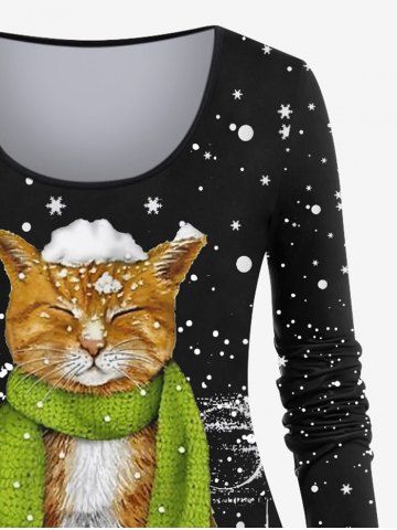 Plus Size Christmas Snowflake Tree Scarf Cat Print T-shirt - Negro - Negro