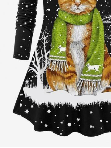 Plus Size Christmas Snowflake Tree Scarf Cat Print T-shirt - Negro - Negro