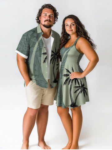 Trajes Hawaianos A Juego > Coconut Tree Tropical Leaf Print Plus Size Matching Hawaii Beach Outfit For Couples