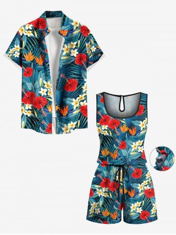 Trajes Hawaianos A Juego > Matching Hawaii Shirt and Romper Plus Size Beach Outfit Tropical Leaf Hibiscus Printed for Couples
