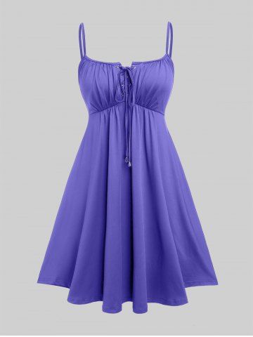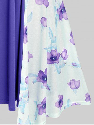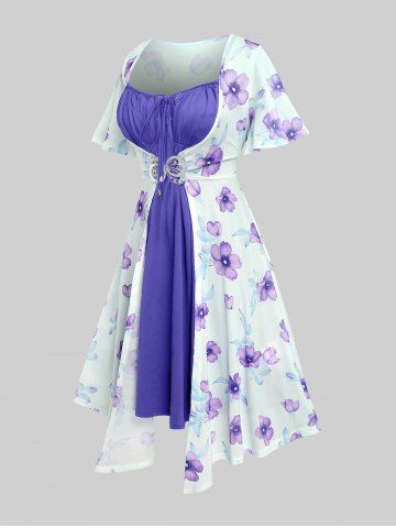 Plus Size Flutter Sleeves Floral Dress and Lace-up A Line Cami Dress Set - Purpúreo Claro - Luz Púrpura