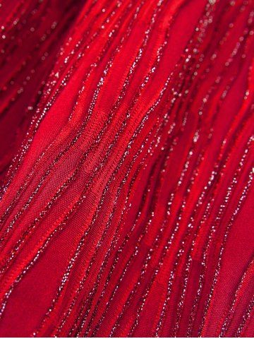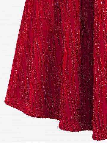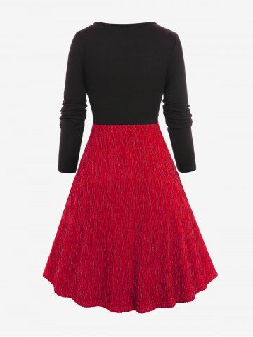 Plus Size Glitter Textured Ribbed Topstitching Lace Up Patchwork 2 in 1 A Line Dress - Rojo - Rojo