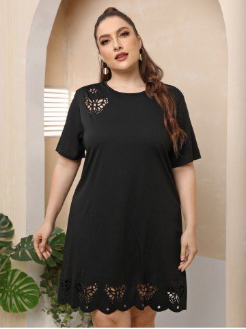 Plus Size Hollow Out Scalloped Hem Solid A Line Dress - Negro - Negro