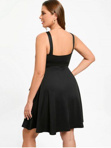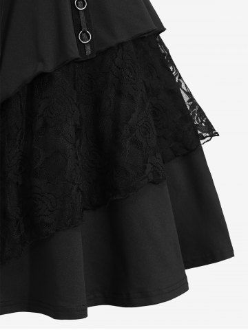 Plus Size Lace-up Lace Floral Panel Layered Ruched O-Ring Dress - Negro - Negro