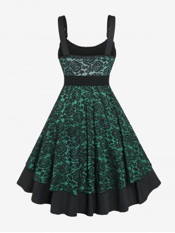 Plus Size Vintage Floral Lace Jacquard Buckled Straps Fit and Flare Belted Dress - Verde Oscuro - M | Us 10