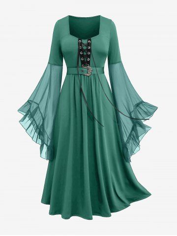 Plus Size Medieval Renaissance Grommets Lace Up Mesh Bell Sleeves Buckle Belt Dress - Verde Claro - Verde Claro