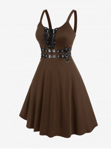 G*****y5Plus Size Lace Up Grommets Fit and Flare DressColor: BLACK Size: 3X | US 22-24Great dress. A-line. Stretchy. Comfy. I get loads of compliments with it. I would size down.