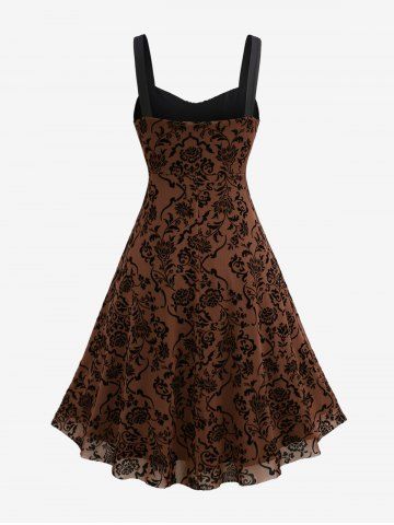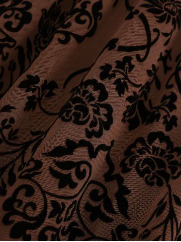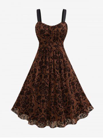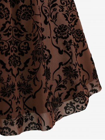 Plus Size Vintage Flower Layered Ruched Mesh A Line Dress - Café - Café