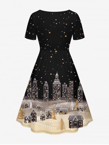 Plus Size Christmas Tree Elk Sled Santa Claus Buildings Moon Star Galaxy Print Cinched Dress - Negro - Negro